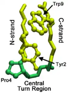 The design of peptides that adopt β-hairpin structure (without relying on metal binding, unusual amino acids, or disulfide crosslinks) has made significant progress and yielded insights into protein dynamics. Unlike α-helices, β-hairpins are not stabilized by a regular hydrogen bonding pattern. As a result, early attempts required at least 20–30 amino acid residues to attain stable tertiary folds of β-hairpins. However, this lower limit was reduced to 12 amino acids by the stability gains conferred by the incorporation of tryptophan-tryptophan cross-strand pairs. Two nonhydrogen-bonding tryptophan pairs have been shown to interlock in a zipper-like motif, stabilizing the β-hairpin structure while still allowing it to remain water-soluble. The NMR structure of a tryptophan zipper (trpzip) β-peptide shows the stabilizing effect of favorable interactions between adjacent indole rings.[7]
