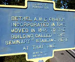 Bethel AME Church and Manse is a historic African Methodist Episcopal church and manse at 291 Park Avenue in Huntington, Suffolk County, New York. The church was built about 1845 and is a 1+1⁄2-story, wood-frame structure that is rectangular in plan with a gable roof and clapboard exterior. The manse was built in 1915 and is a 2-story, wood-frame structure, with a two-by-two-bay square plan.[2]