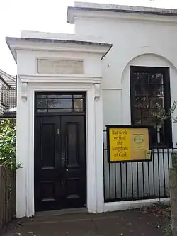 The church was built by John Chapman, who was a market gardener in Petersham.[1] It was funded by subscription and is known as a "Huntington Chapel"[1] as it was opened by Calvinist preacher William Huntington[1][4] who founded or opened chapels throughout England, many of which have survived.[5]