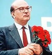 Bettino Craxi was appointed to the vacant position of National Secretary of the party, ending years of factional fighting within the PSI.[30] Ironically, the "old guard" saw him as short-lived leader, allowing each faction time to regroup. However, he was able to consolidate power and implement his policies. In particular, he sought and managed to distance the party from the Communists, bringing it into an alliance with Christian Democracy and other centrist parties, while maintaining a leftist and reformist profile.[31]