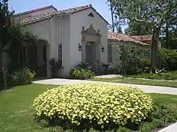 In 1925, they raised US$4,000 at a horse show attended by the likes of Hobart Bosworth, Douglas Fairbanks, Mary Pickford, Stanley S. Anderson (owner of the Beverly Hills Hotel), Cecilia DeMille (daughter of Cecil B. DeMille), Charles E. Toberman, Silsby Spalding (Mayor of Beverly Hills), and Alphonzo Bell (developer of Bel Air, California).[8] Later that year, they used that money to move into the newly constructed clubhouse.[2][3] The clubhouse is a one-story, stucco-clad Spanish Colonial Revival with a tiled hip roof.[7][9] It features pilasters, scrolled brackets, an entablature topped by a pediment with a shield and urn motif surrounding the main door, and casement windows.[7] It was designed by the architectural team Gable & Wyant, who also designed Hangar One.[7][10]