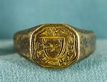 The bezel is a wider, and usually thicker, section of the hoop of a ring, which may contain a flat surface (usually with an engraved design, as in a signet ring), or a gem.[1] The ring is normally worn to display the bezel on the upper or outer side of the finger. The word may also refer to a bezel setting for a stone, which is a general term for a setting holding the stone in place using a raised surrounding for the stone with a lip encircling and overlapping the edges of the stone, thus holding it in place.[2] Modern bezel settings typically use a band of metal containing a groove and a flange (i.e. projecting lip) to hold a watch crystal or gemstone in its setting. This was the earliest method of setting gemstones into jewelry. In historic examples, such rings were often made by leaving a hole or slot in the ring with a thin lip which was bent over once the stone was inserted, holding it in place.