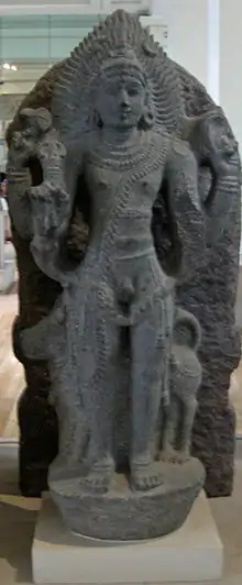 Kala Bhairava (Sanskrit: भैरव, lit. frightful) is a Shaivite deity worshiped by Hindus. In Shaivism, he is a fierce manifestation of Shiva associated with annihilation.[1][2][3][4] In Trika system Bhairava represents Supreme Reality, synonymous to Para Brahman.[5][6] Generally in Hinduism, Bhairava is also called Dandapani ("[he who holds the] Danda in [his] hand"), as he holds a rod or Danda to punish sinners, and Swaswa, meaning "whose vehicle is a dog".[7] In Vajrayana Buddhism, he is considered a fierce emanation of boddhisatva Mañjuśrī, and also called Heruka, Vajrabhairava, and Yamantaka.[8][9]