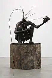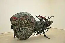 Bharti Kher has worked in a variety of media creating paintings, sculptures, installations, and text.[1][5] Kher's primary material is manufactured versions of traditional Indian bindi.[6][7] Throughout her career Kher has kept some repeating patterns in her paintings from her student years from the late 1980s to the early 1990s.[8] Kher considers how the realities of human life is perceived in our current time.[9] Her works displays fondness towards human drama, as well as intrinsic love.[8] Her sculptures and collages often depict hybrid forms that unite different social constructs such as race, and gender etc.
