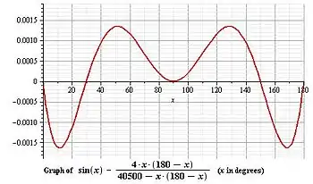 The formula is applicable for values of x° in the range from 0 to 180. The formula is remarkably accurate in this range. The graphs of sin ( x ) and the approximation formula are indistinguishable and are nearly identical. One of the accompanying figures gives the graph of the error function, namely the function,
