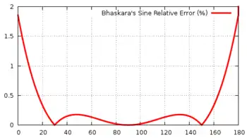In mathematics, Bhaskara I's sine approximation formula is a rational expression in one variable for the computation of the approximate values of the trigonometric sines discovered by Bhaskara I (c. 600 – c. 680), a seventh-century Indian mathematician.[1] This formula is given in his treatise titled Mahabhaskariya. It is not known how Bhaskara I arrived at his approximation formula. However, several historians of mathematics have put forward different hypotheses as to the method Bhaskara might have used to arrive at his formula. The formula is elegant, simple and enables one to compute reasonably accurate values of trigonometric sines without using any geometry whatsoever.[2]