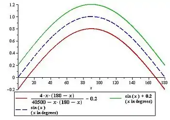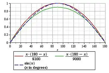 The part of the graph of sin(x) in the range from 0° to 180° "looks like" part of a parabola through the points (0, 0) and (180, 0). The general such parabola is