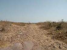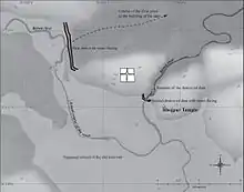 The dams were constructed of cyclopean masonry on a massive scale. The dam to the north is preserved, but the one immediately below the temple was knocked down by an exceptional surge in the Monsoon that occurred in the mid-eleventh century.[1] A myth about the Bhojpur dams has emerged thanks to the writing of William Kincaid.[2] He mis-interpreted an account in a Persian chronicle (recording that a dam was opened on the orders of Hoshang Shah of Malwa), as referring to Bhojpur, an idea elaborated by U. N. Day in 1965 and repeated subsequently in the years that followed.[3] The account, translated by U. N. Day from Persian, states that the king pulled down a dam at the request of local merchants in Bhopal and Vidisha whose caravans were being raided by bandits who would take refuge at an inaccessible spot protected by the lake. This account refers to the Bhojtal at Bhopal where even today an island in the middle of the lake can be seen. The dam at Bhopal was subsequently repaired and further raised when the Kamlapati Palace was constructed in the eighteenth century.