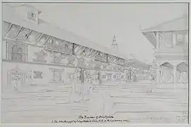 This palace seems to have been damaged due to an earthquake in 1681 but the renovation work is not credited to the then king, Jitamitra Malla. Instead, the damaged palace was renovated and repaired by Bhupatindra Malla.[83] Although, Jitamitra Malla had started the renovation of other damaged buildings like the Chaukot Lyākū palace and the courtyard of the Kumari Chwōka, the later of which took 14 years to renovate.[84] Bhupatindra Malla also added two large stone statues of Ugrachandi (a fierce manifestation of Dévi) and Ugrabhairava (a fierce form of Bhairava) on the either sides of the entrance to the palace in a similar manner to Simhadhwakha Lyākū.[85][83] There is a common belief among the locals that Bhupatindra Malla found the statues of Ugrachandi and Ugrabhairava so artistic that he had the arms of the artisan, who made them cut off so that he wouldn't replicate the statues anywhere.[85] Although, there was a fierce competition between the three kingdoms of the Kathmandu Valley in the field of arts, there is no real evidence to support that the artisan's hands were cut off.[83] The inscriptions carved on the pedestal of these statues credit them to Bhupatindra Malla and date them to around May 1706, suggesting the renovation of Basantapur Lyākū was completed around the same time as well.[83] Today, only these statues and two large stone images of guardian lions remain as the palace couldn't survive the lack of maintenance following the end of the Malla dynasty and the repeated earthquakes of 1833 and 1934.[83] One of the only few visual depictions of this palace is a watercolour done by Oldfield which shows this palace in an extremely damaged condition.