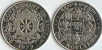 Until 1789, the coins of the Cooch Behar mint circulated in Bhutan.[3] Following this, Bhutan began issuing its own coins known as chetrum, mostly silver 12 rupees. Hammered silver and copper coins were the only types issued until 1929, when modern style silver 12 rupee coins were introduced, followed by bronze 1 paisa in 1931 (dated 1928). Nickel 12 rupee coins were introduced in 1950. While the Cooch Behar mint coins circulated alongside Bhutan's own coins, decimalization was introduced in 1957, when Bhutan's first issue of coins denominated in naya paisa. The 1966 issues were 25 naya paisa, 50 naya paisa and 1 rupee coins, struck in cupro-nickel.[4]