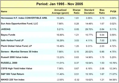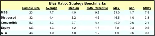 Strategies that employ illiquid assets can have bias ratios with an order of magnitude significantly higher than the bias ratios of indices representing the underlying asset class. For example, most equity indices have bias ratios falling between 1.0 and 1.5. A sample of equity hedge funds may have bias ratios ranging from 0.3 to 3.0 with an average of 1.29 and standard deviation of 0.5. On the other hand, the Lehman Aggregate MBS Index had a bias ratio of 2.16, while MBS hedge funds may have bias ratios from a respectable 1.7 to an astounding 31.0, with an average of 7.7 and standard deviation of 7.5.