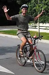 If the steering of a bike is locked, it becomes virtually impossible to balance while riding. On the other hand, if the gyroscopic effect of rotating bike wheels is cancelled by adding counter-rotating wheels, it is still easy to balance while riding.[5][6] One other way that a bike can be balanced, with or without locked steering, is by applying appropriate torques between the bike and rider similar to the way a gymnast can swing up from hanging straight down on uneven parallel bars, a person can start swinging on a swing from rest by pumping their legs, or a double inverted pendulum can be controlled with an actuator only at the elbow.[33]