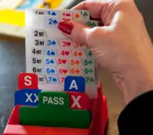 A bidding box is a device used for bidding in bridge, usually in duplicate bridge competitions. Made in various configurations and sizes, it is typically a plastic box with two holding slots, each containing a set of bidding cards: one with 35 cards with symbols of bids, and the other with cards for other calls (pass, double, etc.).