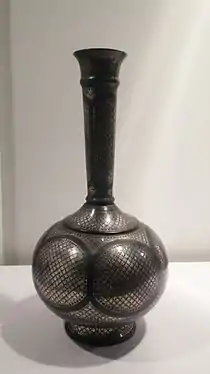 Bidriware is a metal handicraft from Bidar. It was developed in the 14th century C.E. during the rule of the Bahmani Sultans.[1] The term "bidriware" originates from the township of Bidar, which is still the chief centre for the manufacture of the unique metalware.[2] Due to its striking inlay artwork, bidriware is an important export handicraft of India and is prized as a symbol of wealth. The metal used is a blackened alloy of zinc and copper inlaid with thin sheets of pure silver.[2] This native art form has obtained Geographical Indications (GI) registry.[3]