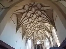 A hall church with three naves that retains a design close to the original,[1][2] it was the last such church built in Transylvania, and was constructed between 1486 and 1524[2] on the site of an earlier Romanesque church.[1][2] Dedicated to the Virgin Mary and built in Late Gothic style with Renaissance touches,[2][3][4] the structure was constrained by the hilly landscape. The choir is 18 m in length, with a rib-vaulted ceiling, while the three naves of equal height also have rib vaulting. A defensive level above the choir has parapets and a battlement.[2] A second, wooden, level was demolished in 1803.[1] The polyptych altarpiece has 28 panels executed between 1482 and 1513 by a painter likely trained at Vienna and Nuremberg. In the center, there is a sculpted group: a crucifix with Jesus Christ hanging, Mary standing and Mary Magdalene embracing the cross. The upper side panels show visions of Ezekiel and Augustus.[2] The stone pulpit, which shows scenes carved in relief, dates to 1523. The richly decorated intarsia door of the sacristy has a complex lock, displayed at the 1889 Paris World's Fair. Its central system blocks the door in thirteen points, ensuring the safety of the valuables kept in the sacristy.[1]