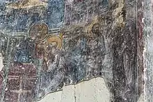 The Bieti church, measuring 11.8 × 17.7 m, was built of dressed stone in a cross-in-square plan, with the centrally located and outsized dome and semicircular apse with the deep bema. The dome, all of the arches and vaults as well as the upper part of the apse have collapsed, their ruins filling up the interior. Only the conch of the sanctuary and the pastophoria survive. The eastern wall still retains fragments of medieval frescoes influenced by the late Byzantine Palaeologan art. The outer walls were decorated with stone carvings and bore inscriptions in the medieval Georgian asomtavruli script. One of them, now lost, commemorated the construction of the chapel in 1493.[3] The art historian Vakhtang Beridze classifies the church as belonging to a group of the domed churches of medieval Samtskhe, which also includes Sapara, Zarzma, and Chule.[3]