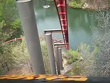 The train then enters a set of Block Brakes. Following the brakes, the train then turned right, and began to ascend a second lift hill. The second lift hill climbed towards the park's mock Rhine River. At the top of the 100-foot (30 m) lift, the ride turned 90 degrees to the left, before traveling down the climatic 80-foot (24 m) drop, barreling straight towards the river at 48 miles per hour (77 kilometres per hour), swooping to the left in close proximity to the water.
