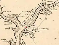 The original house was built in about 1750 by the Owen family of Orielton who owned coal mines in the area. A map of 1785 shows the Landshipping Estate.[3] The house is drawn as a dwelling house near the river (red arrow) while the Owens’ much larger residence called “Great House” is to the right of it.