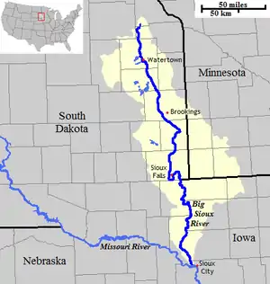 The Big Sioux River is a tributary of the Missouri River in eastern South Dakota and northwestern Iowa in the United States.[2] It flows generally southwardly for 419 mi (674 km),[3] and its watershed is 9,006 sq mi (23,330 km2).[1] The United States Board on Geographic Names settled on "Big Sioux River" as the stream's name in 1931.[4] The river was named after the Lakota people (Sioux Natives)[5] which was known by them as Tehankasandata, or Thick Wooded River.[6]