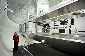 In December 2012, Bigelow began development work on the Bigelow Expandable Activity Module (BEAM) under a US$17.8 million NASA contract.[12] After a number of delays, BEAM was transported to ISS arriving on 10 April 2016, inside the unpressurized cargo trunk of a SpaceX Dragon during the SpaceX CRS-8 cargo mission.[13] The mission tested the BEAM module's structural integrity, leak rate, radiation dosage and temperature changes over a two-year-long mission.[13] At the end of BEAM's mission, the module was planned to be removed from the ISS and burn up during reentry.[13] In October 2017, it was announced that the module would stay attached to the ISS for at least three more years, with options for two further one-year extensions.[61]