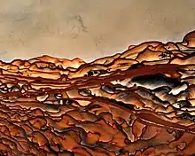 When lava next flowed over it, the heat and pressure transformed the muddy mixture. As water escaped it in the form of superheated steam, pressure variations resulted in flexation and many short fluctuating changes, reflected in the jasper's many thin, parallel bands.[1]: 58 The hydrothermal reaction progressed as a shock wave through the mud, removing iron from it and depositing the iron as intertwining bands of limonite. The altered rock remained plastic, and subject to local movement as a result of pressure changes. These caused the great variety of marbled, rosette-like and picture designs found in Biggs jasper.[1]: 59
