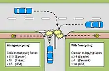 A large study undertaken by S.U. Jensen et al.[8][9] into the safety of Copenhagen cycle tracks before and after they were constructed concludes "The construction of cycle tracks in Copenhagen has resulted in an increase in cycle traffic of 18–20% and a decline in car traffic of 9–10%. The cycle tracks constructed have resulted in increases in accidents and injuries of 9–10% on the reconstructed roads." The number of accidents and injuries increased at intersections but decreased mid-block. These changes in road safety have been estimated taking both general trends in safety and changes in car and cycle traffic into account. The Copenhagen study also found accident and injury rates were related to the amount of car parking and number of turn lanes, blue cycle crossing markings, and raised exits at non-signalised intersections, suggesting that risk is dependent on making various improvements to the cycle tracks. For instance, recent planning guidelines in the US advise that cycle tracks drop to a bike lane before arriving at an intersection to increase the visibility of cyclists.[10]