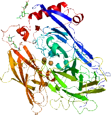 Cartoon representation of the X-ray structure of bilirubin oxidase from Myrothecium verrucaria based on PDB accession code 2xll. The protein ribbon is rainbow colored with the N-terminus in blue and the C-terminus in red. The four copper atoms are shown as spheres and the glycans shown as sticks. | |||||||||