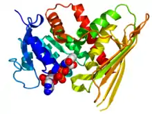 BVR is composed of two closely packed domains, between 247-415 amino acids long and containing a Rossmann fold.[4] BVR has also been determined to be a zinc-binding protein with each enzyme protein having one strong-binding zinc atom.[5][6]