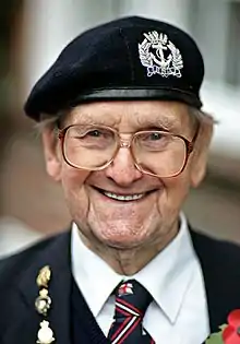 He served on the Arctic convoys and in the Mediterranean, and was also torpedoed twice. The second time was while serving aboard the Fiji-class light cruiser HMS Newfoundland during the Allied invasion of Sicily, when it was torpedoed by the German submarine U-407.[2][5] Following temporary repairs in Malta, the ship limped across the Atlantic steering using only its two propellers, for full repair at the Boston Navy Yard.[5] He was Mentioned in Despatches on 21 December 1943 for his service on this occasion.[4][6] He served with the occupation forces in north Germany, and was a Stoker Chief Petty Officer when he left the navy in 1945.[2] After the war, he ran his own barber's shop, where he also sold cigarettes and smoking tobacco, he retired in 1968.[4]