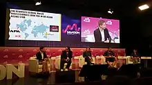 As a media focal point for K-pop information, in 2016 alone, K-Town columnist Benjamin participated in K-pop conferences and media inquiries about K-pop's status in America. In February, he spoke on a Boston University College of Arts and Sciences' panel, "Music & Media: Korean Pop Industry", which included issues about K-pop's fit with Western culture and the Korean entertainment industry's close scrutiny of media interviews.[39] In June, at KCON NY, he told NBC News Stephany Bai that K-pop was gaining global fans while retaining its "distinctive characteristics". He credited its continued success with things like accessibility on social media, song titles in English on YouTube, and an ability to involve fans in what he called K-pop's "scene" rather than a genre, which involves them in a "whole different world".[40] In July, with almost 190 foreign reporters registered to cover KCON LA, he told Korea Times reporter Si-soo Park, "K-pop is getting closer to the mainstream", and mentioned its coverage by major news outlets like The New York Times and others.[41] In November, he contributed K-pop analysis for a Time report on artists CL, Eric Nam, and Dean's attempts to enter the mainstream music market in America.[42]