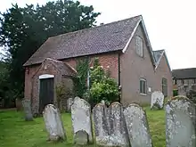Worshippers from across northern Sussex came to this chapel; many were from the village of Billingshurst a few miles away.[4][6] This group later became large enough to split from the Horsham congregation and establish a chapel in their home village. They chose a grassy, raised site set back from the west side of the High Street,[7] and erected a modest cottage-like chapel in 1754.[note 1][7][8][9] The founders were William Turner and William Evershed, whose initials are recorded on a dated stone tablet inside.[10] Evershed was a General Baptist preacher at Horsham who moved to a farm in Billingshurst in 1742; together with Turner he held and preached at small meetings in Billingshurst.[6] The Evershed family had a long-lasting connection with the chapel: more than 120 Eversheds of various generations, including William himself,[11] are buried in the graveyard,[12] a "surprisingly big" area which surrounds the chapel and helps it "make a display in spite of itself" and its modest architecture.[7] After making plans for a chapel in the village in 1753,[6] Turner and Evershed bought the site for three guineas (£490 as of 2022).[12][13] The chapel was registered for worship in October 1754;[6] its date of founding makes it one of the oldest Nonconformist places of worship in both the Horsham district and the whole of southeast England.[8][12]