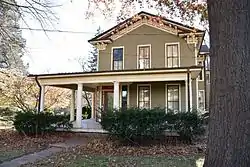 The Billingsley-Hills House, also known as the Veatch Residence, is a historic building located in Iowa City, Iowa, United States. This is one of several transitional Greek Revival to Italianate houses built in this area in the years before and after the American Civil War making it a very popular style here.[2] Over the years, however, most of them have either been torn down or altered beyond recognition leaving this house as one of few left with its integrity intact. When this house was built in 1870 it was situated on a 38-acre (15 ha) estate, but by the turn of the 20th-century the lot was reduced to its present size. Situated in a residential area with the University of Iowa Hospitals and Clinics across the street, the two-story frame house features a low pitched gable roof, bracketed eaves, an entablature with dentils and returns, and a wrap-around front porch.