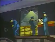 The film starts with an image of the front page of the Daily Planet, reporting the shipment of a billion dollars of gold to the US mint. A train is being loaded with hundreds of bars of gold, guarded by several armed police officers. The locomotive is identical to the unique one used by the Twentieth Century Limited beginning in 1938. Further ahead, in a passenger coach, Lois Lane boards with help from Clark Kent, who says he wishes he could come, but he has another story to cover. As the last of the gold is loaded, a car a few hundred yards away turns on its lights, and the men inside put on robbers' masks and arm themselves. The mysterious car follows the train.