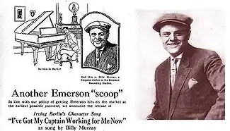 Billy Murray was born in Philadelphia, Pennsylvania, to Patrick and Julia (Kelleher) Murray, immigrants from County Kerry, Ireland.[2][3] His parents moved to Denver, Colorado, in 1882, where he grew up. He became fascinated with the theater and joined a traveling vaudeville troupe in 1893. He also performed in minstrel shows early in his career. In 1897 Murray made his first recordings for Peter Bacigalupi, the owner of a phonograph company in San Francisco. As of 2010, none of Murray's cylinder records with Bacigalupi are known to have survived.[3] In 1903, he started recording regularly in the New York City and New Jersey area, where major record companies in the U.S. as well as the Tin Pan Alley music industry were concentrated.