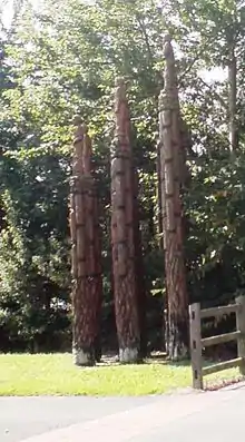 At the Bilston end of the Black Country Route can be seen the group of wooden statues designed by Robert Koenig and called "Steel Columns." "This sculpture was made from 15 lengths of sweet chestnut which stretch up to 6 metres in height. The male and female figures depicted are based on those found in old Victorian photographs of Bilston. The title Steel Columns is a reference to Bilston's steel making background and the connection the figures had with this history."[15]