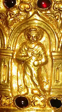 The casket features hellenistic representations of the Buddha (contrapposto pose, Greek himation, bundled hairstyle, wearing a moustache, realistic execution),[4] surrounded by the Indian deities Brahma and Śakra, inside arched niches (called "homme arcade", or caitya) of Greco-Roman architecture. There are altogether eight figures in high-relief (two identical groups of Brahman-Buddha-Indra, and two devotees or Bodhisattvas in-between) and two rows of rubies from Badakhshan.[4]