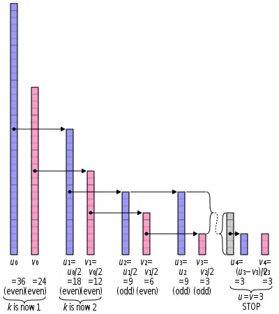 The algorithm reduces the problem of finding the GCD of two nonnegative numbers v and u by repeatedly applying these identities: