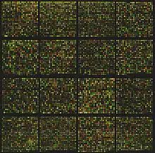 A microarray for approximately 8700 genes. The expression rates of these genes are compared using binary logarithms.