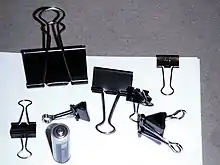 The binder clip is in common use in the modern office. It can hold a few to many sheets of paper, and is usually used in place of the paper clip for large volumes of paper. Various practical (and sometimes whimsical) alternative uses have been proposed. These include holding pieces of quilt together, creating a "beer pyramid" in a refrigerator with wire shelves, serving as a bookmark, a cheap alternative to a money clip or preventing computer cables from slipping behind desks.[1] Smaller sized clips have been commonly used as "quick fix" fitting and sizing solutions in the fashion industry.