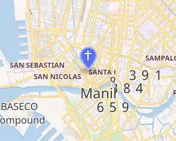 Binondo Church, also known as the Minor Basilica and National Shrine of Saint Lorenzo Ruiz and formerly known as Our Lady of the Most Holy Rosary Parish (Spanish: Basílica Menor de San Lorenzo Ruiz y Parroquia de Nuestra Señora del Santísimo Rosario), is located in the District of Binondo, Manila fronting Plaza San Lorenzo Ruiz, in the Philippines. This church was founded by Dominican priests in 1596[2] to serve their Chinese converts to Christianity.[3] The original building was destroyed in 1762 by British bombardment. A new granite church was completed on the same site in 1852 however it was greatly damaged during the Second World War, with only the western façade and the octagonal belfry surviving.