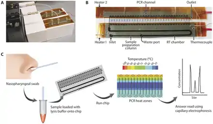 - Continuous flow-based architecture moves the sample through different temperature zones to achieve thermal cycling.[39] This approach uses less energy and has high throughput, but has large reagent consumption and gas bubbles can form inside the flow channels.[3]