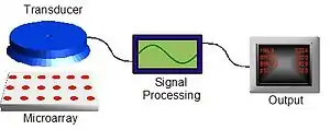 Figure 1 shows the make up of a typical biochip platform. The actual sensing component (or "chip") is just one piece of a complete analysis system. Transduction must be done to translate the actual sensing event (DNA binding, oxidation/reduction, etc.) into a format understandable by a computer (voltage, light intensity, mass, etc.), which then enables additional analysis and processing to produce a final, human-readable output. The multiple technologies needed to make a successful biochip—from sensing chemistry, to microarraying, to signal processing—require a true multidisciplinary approach, making the barrier to entry steep. One of the first commercial biochips was introduced by Affymetrix. Their "GeneChip" products contain thousands of individual DNA sensors for use in sensing defects, or single nucleotide polymorphisms (SNPs), in genes such as p53 (a tumor suppressor) and BRCA1 and BRCA2 (related to breast cancer).[8] The chips are produced by using microlithography techniques traditionally used to fabricate integrated circuits (see below).