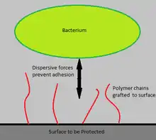 Dispersion forces between the polymer chains and the bacterial cells prevent bacteria from binding to the surface and initiating biofilm growth. The concept is similar to that of steric stabilization of colloids. Polymer chains are grafting to a surface via covalent bonding or adsorption. The solubility of these polymers stems from the high conformational entropy of polymer chains in solution. The Χ (Chi) parameter is used to determine whether a polymer will be soluble in a given solution. Χ is given by the equation: