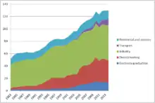 Sweden's energy usage is divided into three sectors: housing and services, industry, and transport and is used in three different ways: to produce heating, electricity and vehicle fuels.[3] In 2014 Sweden has used 555 TWh of energy, 130 of which came from biofuels.[4]