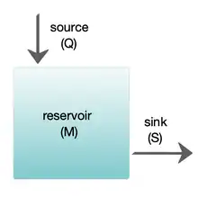 The diagram at the right shows a basic one-box model. The reservoir contains the amount of material M under consideration, as defined by chemical, physical or biological properties. The source Q is the flux of material into the reservoir, and the sink S is the flux of material out of the reservoir. The budget is the check and balance of the sources and sinks affecting material turnover in a reservoir. The reservoir is in a steady state if Q = S, that is, if the sources balance the sinks and there is no change over time.[9]