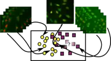 Methods used are based on machine learning, building a discriminative classifier based on numeric features computed from the image. Features are either generic features from computer vision, such as Haralick texture features or features specially designed to capture biological factors (e.g., co-localization with a nuclear marker being a typical example).