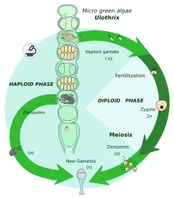 Some red algae (such as Bonnemaisonia[17] and Lemanea) and green algae (such as Prasiola) have vegetative meiosis, also called somatic meiosis, which is a rare phenomenon.[18] Vegetative meiosis can occur in haplodiplontic and also in diplontic life cycles. The gametophytes remain attached to and part of the sporophyte. Vegetative (non-reproductive) diploid cells undergo meiosis, generating vegetative haploid cells. These undergo many mitosis, and produces gametes.