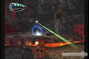Bionicle is a 3D platform game.[1] The game's levels vary between normal platforming levels and levels that use mechanics like snowboarding or lava surfing.[2] Lightstones are scattered throughout each level, and collecting them unlocks bonus content.[3] Captive Matoran characters are located in some levels, and finding them is necessary to solve puzzles.[4] Each Toa character can attack using elemental energy; the attacks automatically target enemies. By timing attacks correctly, the player can launch a multi-bolt attack.[5] Elemental energy depletes after each use. In order to replenish their supply, the player can shield and absorb attacks from enemies or draw in energy directly from the environment. When drawing from the environment, the player is vulnerable to attack.[6] Elemental energy can also be resupplied by finding masks – called Kanohi – of elemental energy.[5]