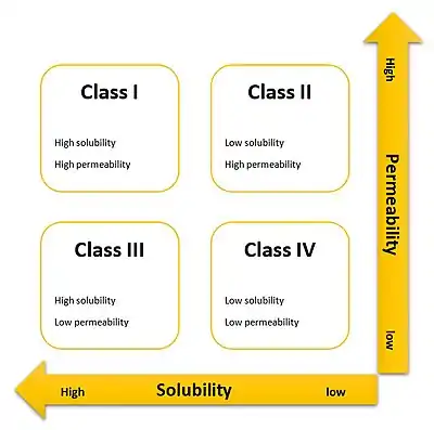 According to the Biopharmaceutical Classification System (BCS) drug substances are classified to four classes upon their solubility and permeability:[1]