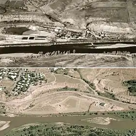 Evolution of the Old Rifle UMTRA Site (Colorado, US) from 1957 (above) until 2008 (below), in which biostimulation tasks were carried out.[29]